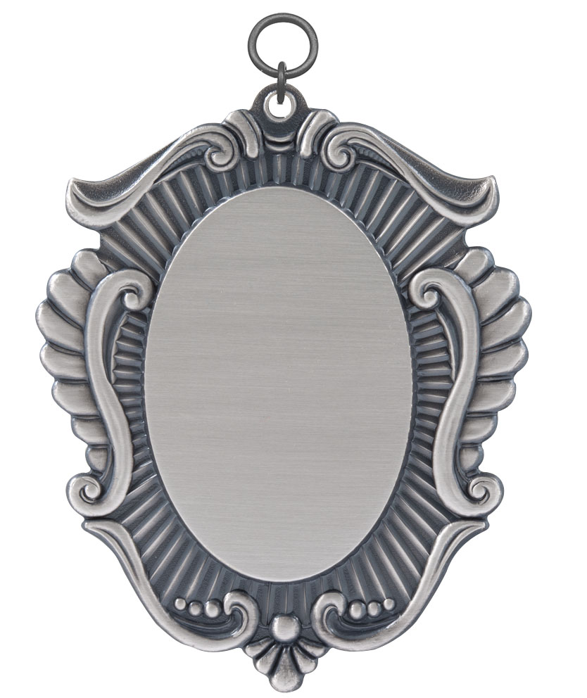 Kettenschild mit verziertem Rand und ovaler GravurflächeGroßes, spitz zulaufendes Schild mit filigraner, geschnörkelter Verzierung am RandGröße ca. 115 mm x 67 mmOberfläche mit galvanischer Veredelung (Schutzschicht) für besonders hohe WiderstandsfähigkeitVersehen mit einem feinen Speziallack, der das Metall, auch Silber, vor Feuchtigkeit und Schmutz schütztMit zwei Ösen und zwei Ringen zur sicheren BefestigungErhältlich in versilbert und AltsilberDieses Kettenschild kann durch eine individuelle Gravur auf Vorder- und/oder Rückseite veredelt werden.