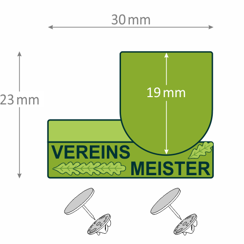 Das Metallabzeichen hat eine Gesamtgröße von 30 mm x 23 mm. In der Mitte befindet sich eine freie Wappenfläche (16 mm x 19 mm), die mit deinem individuellen Motiv, Logo oder Wappen gestaltet werden kann. Ein geprägtes Ehrenlaub mit 3D-Schriftzug „Vereinsmeister“ rahmt die Fläche edel ein.