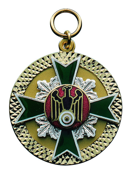 Dieser goldene Anhänger ist mit einem silbernen Kreuz und einer roten Adler-Auflage verziert. Der schwarze Schützenadler auf der weißen Zielscheibe wird von einem eleganten, grünen Kreuz und silbernem Eichenlaub ergänzt. Die galvanische Veredelung sorgt für hohe Widerstandsfähigkeit und schützt den Anhänger vor Feuchtigkeit und Schmutz.