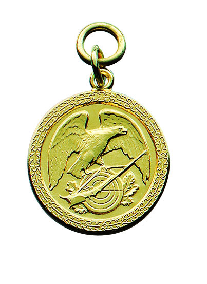 Dieser Anhänger mit Adler zeigt einen Schützenadler mit einer Zielscheibe und einem Eichenlaubrand. Mit einem Durchmesser von ca. 24 mm und einer galvanischen Veredelung bietet der Anhänger eine besonders hohe Widerstandsfähigkeit und ist gleichzeitig vor Feuchtigkeit und Schmutz geschützt.