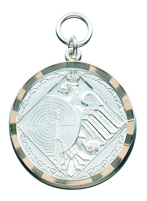 Medaille für Schützen und Schützinnen mit KönigsadlerRunde Medaille mit Eichenlaub und königlichem Adler hinter großer ZielscheibeDurchmesser ca. 33 mm oder 39 mm (Bitte auswählen!)Oberfläche mit galvanischer Veredelung (Schutzschicht) für besonders hohe WiderstandsfähigkeitVersehen mit einem feinen Speziallack, der das Metall, auch Silber, vor Feuchtigkeit und Schmutz schütztMit Öse und Ring zur sicheren BefestigungErhältlich in vergoldet, versilbert, Altsilber, Bronze und Echt Silber, versilbertDiese Medaille kann durch eine individuelle Gravur auf der Rückseite veredelt werden.Sie ist in verschiedenen Größen und Farben erhältlich. Bitte wählen Sie Ihre gewünschte Ausführung.