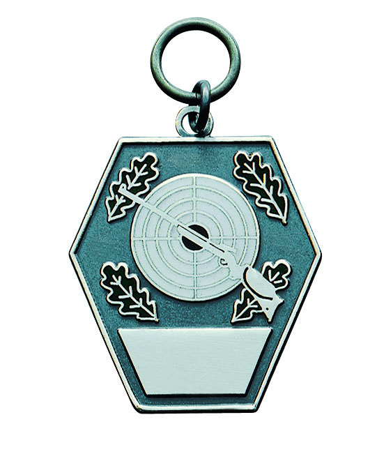 Ein auffälliger Anhänger in Zielscheibenform, der mit einem Gewehr und Eichenlaub verziert ist. Dieser Anhänger kombiniert klassische Schützenmotive und schafft ein markantes Design, das sowohl Tradition als auch Stil verkörpert.