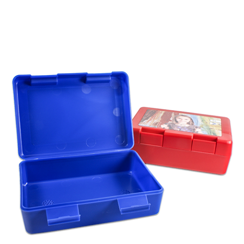 Die Brotdose ist in vier Farben erhältlich: Blau, Rot, Hellblau und Pink – so findet jeder seine Lieblingsfarbe.