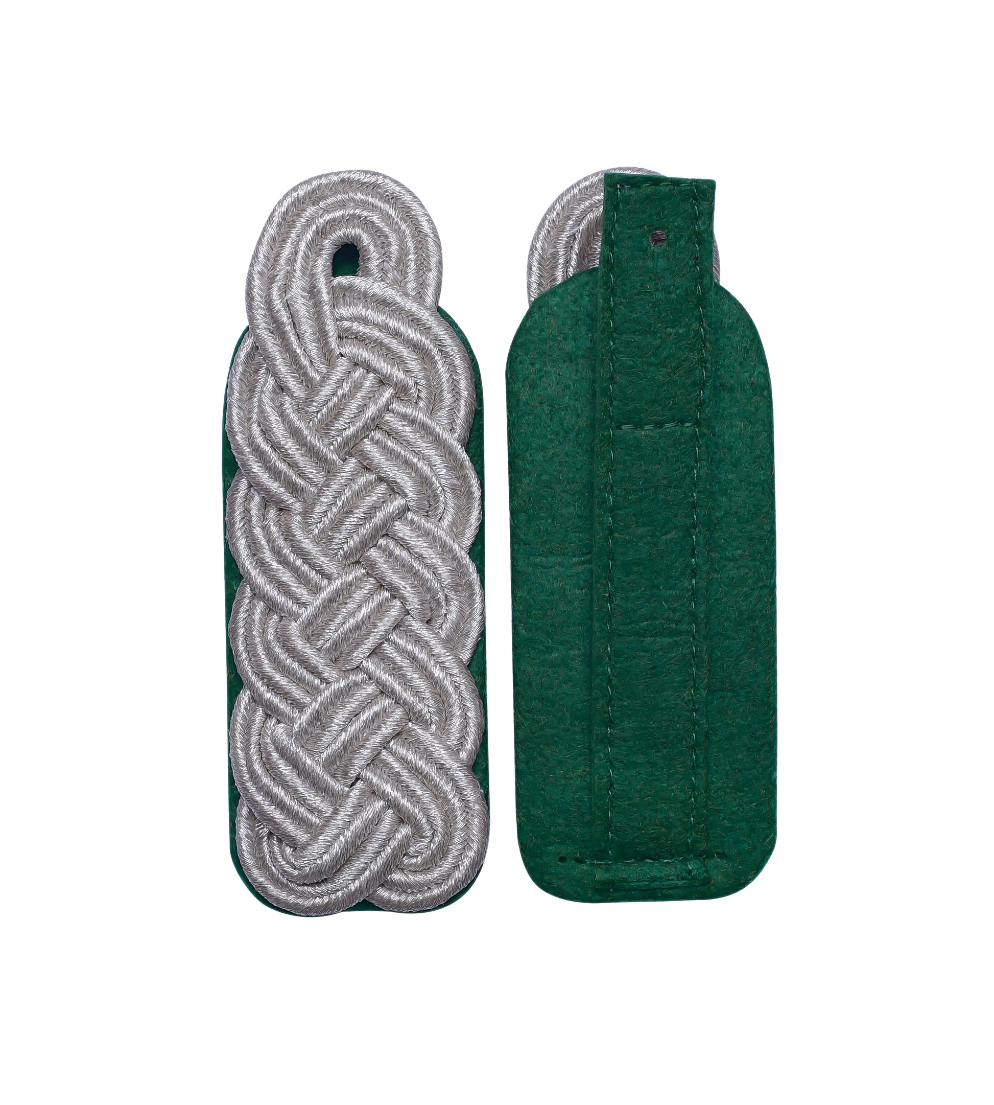 Das silberfarbige Majorgeflecht auf grünem Filz ist ein klassisches und rangtypisches Schultergeflecht für Schützenuniformen. Die 5-bogige Ausführung steht eindeutig für den Rang Major und sorgt für eine klare, traditionsbewusste Darstellung innerhalb der Uniform.