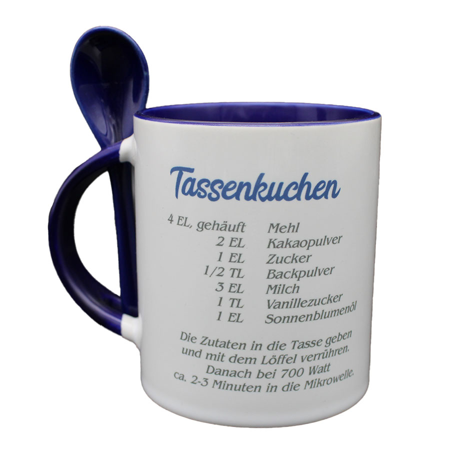 Auf der Vorderseite der Tasse steht der humorvolle Spruch: "Wenn du denkst, es geht nicht mehr, muss ganz schnell ein Tassenkuchen her!" – eine Einladung, sich einen Moment der Entspannung mit einem leckeren, schnellen Kuchen zu gönnen. Auf der Rückseite findest du ein leichtes Rezept für einen Tassenkuchen, das du direkt in der Tasse zubereiten kannst. Der dunkelblaue Porzellanlöffel, der an der Seite der Tasse befestigt ist, rundet das praktische Design ab und sorgt dafür, dass du den Kuchen direkt genießen kannst.