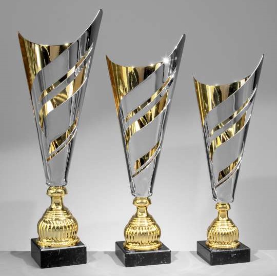 Die Pokalserie „Ben“ überzeugt durch ihr modernes Design und die edle Kombination von versilberter Außenfläche, vergoldetem Inneren und vergoldetem Fuß auf einem stabilen schwarzen Sockel im Marmorimitat. Diese Pokale sind die perfekte Auszeichnung für herausragende Leistungen und ein echter Blickfang bei jeder Preisverleihung.