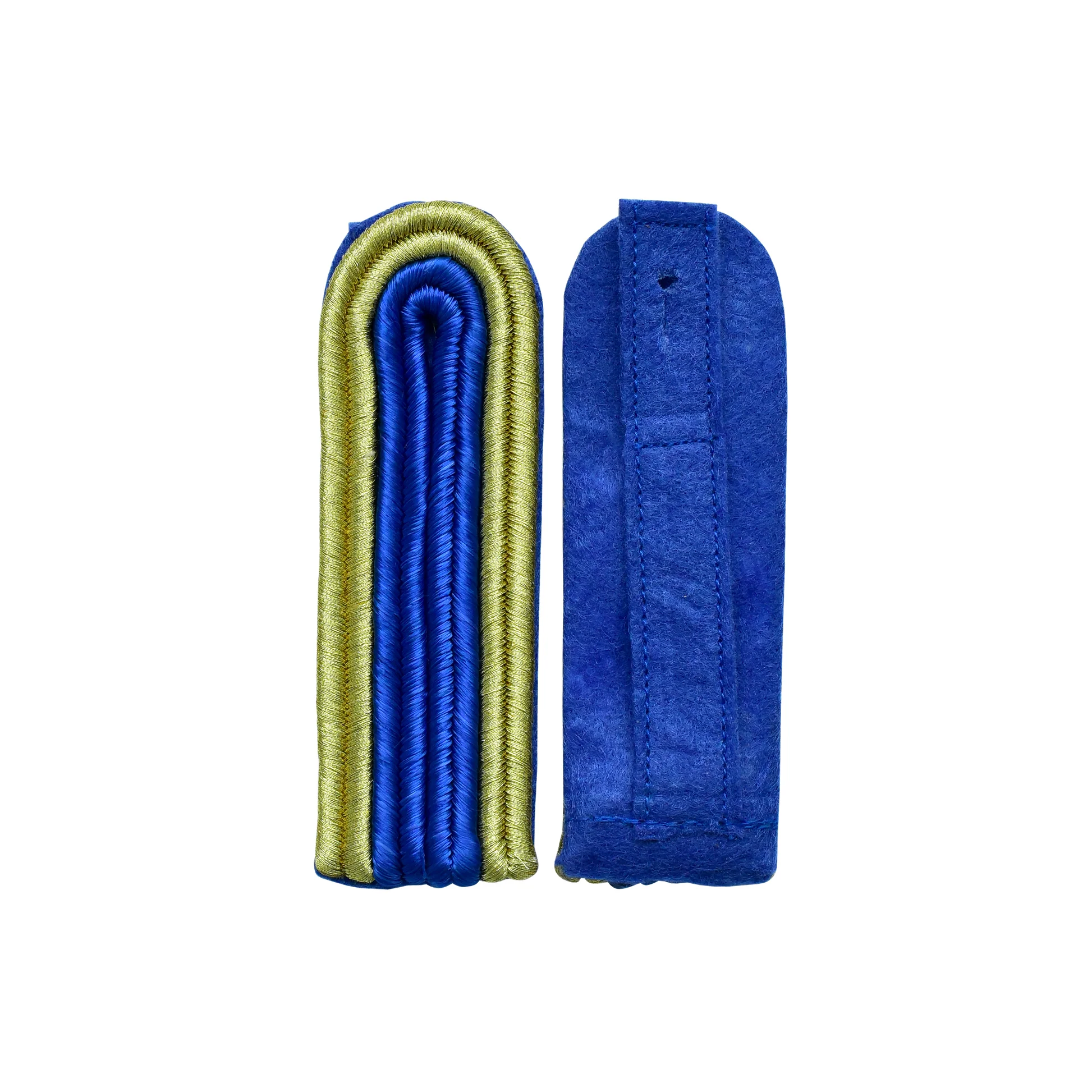 4-streifige Schulterstücke Gold mit blauer Innensoutache – auf blauem Filz | ca. 11 × 3,5 cm