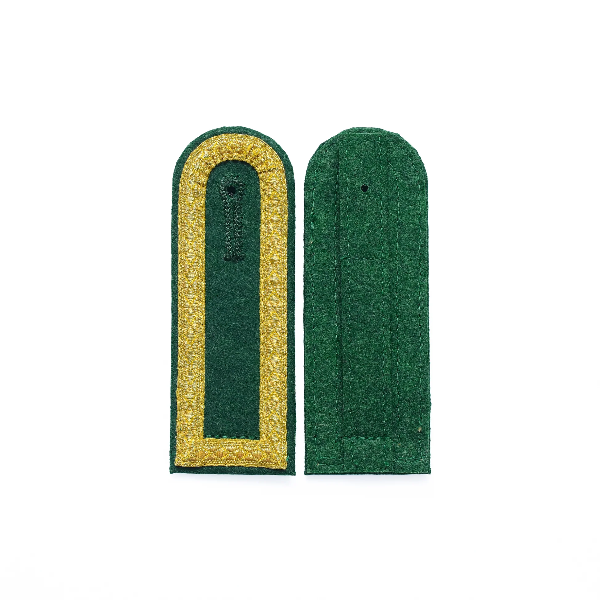 Durch die rund ausgeführte Form und das integrierte Knopfloch lassen sich die Schulterklappen einfach und sicher an der Uniform befestigen. Die umlaufende Goldtresse auf allen vier Seiten verleiht der Schulterklappe eine besonders wertige und repräsentative Optik. Zusätzlich sorgt die Lasche für einen festen Sitz und eine zuverlässige Fixierung.