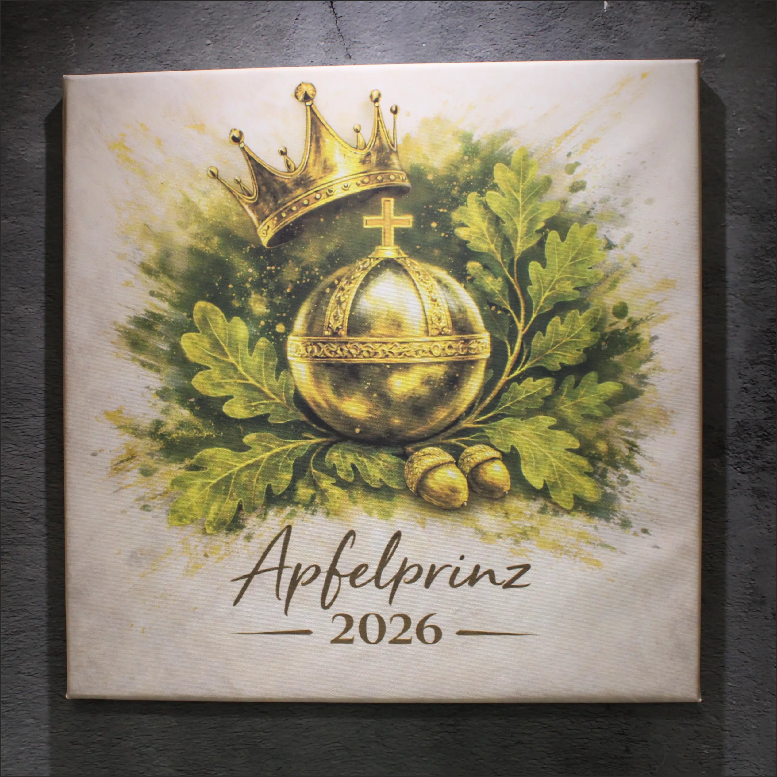 Mit dieser hochwertigen Leinwand hältst du genau dieses Amtsjahr sichtbar fest. Das Motiv mit Reichsapfel, Krone und Eichenlaub symbolisiert Tradition, Verantwortung und die besondere Rolle des Apfelprinzen im Schützenfest.