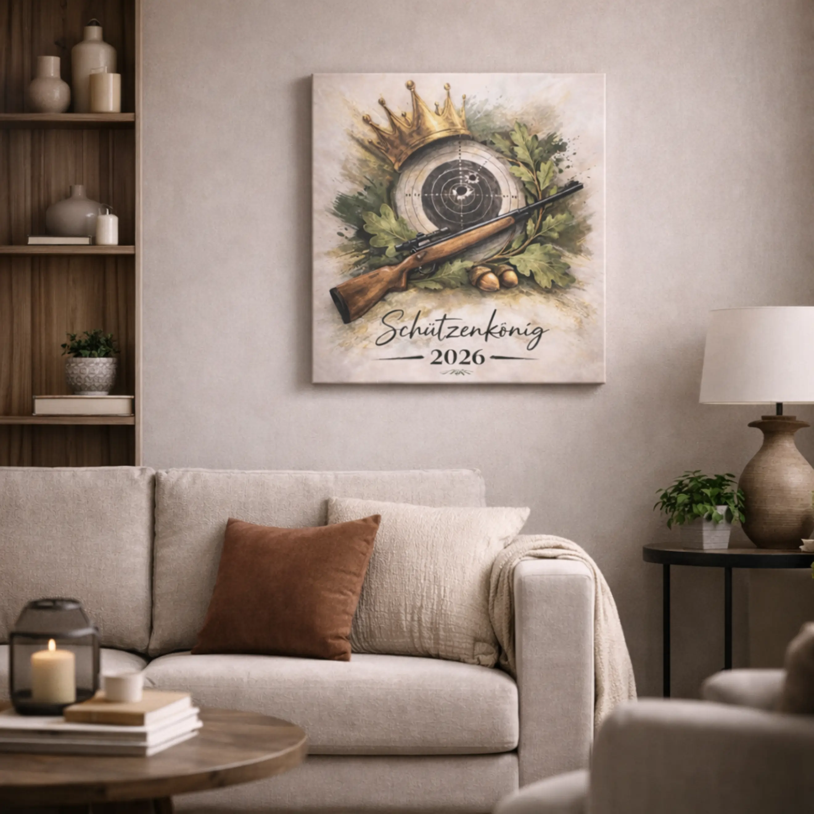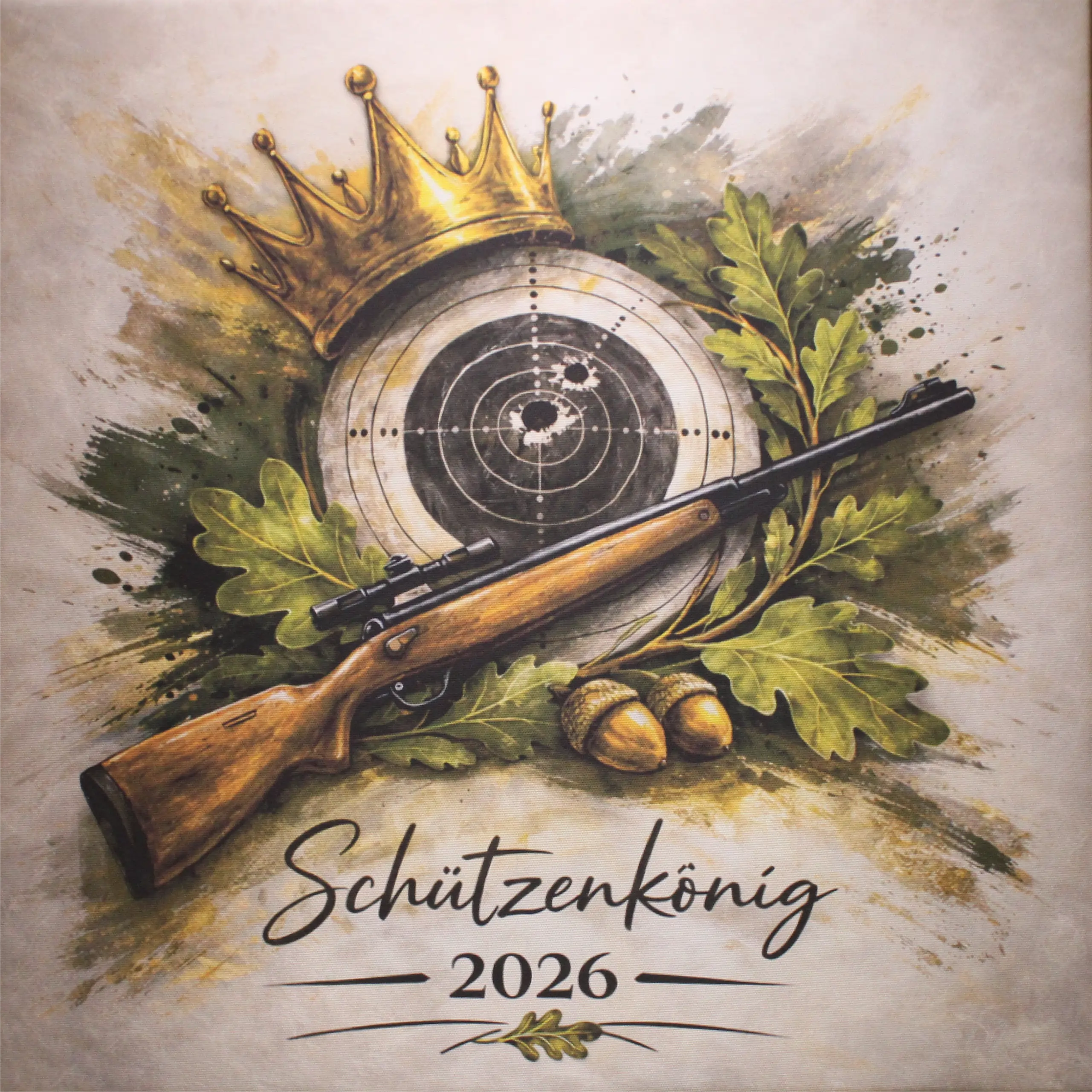 Mit dieser hochwertigen Leinwand hältst du genau diesen besonderen Moment fest. Das Motiv mit Krone, Zielscheibe, Gewehr und Eichenlaub symbolisiert die Werte des Schützenwesens – Würde, Treffsicherheit und Verbundenheit zum Verein.