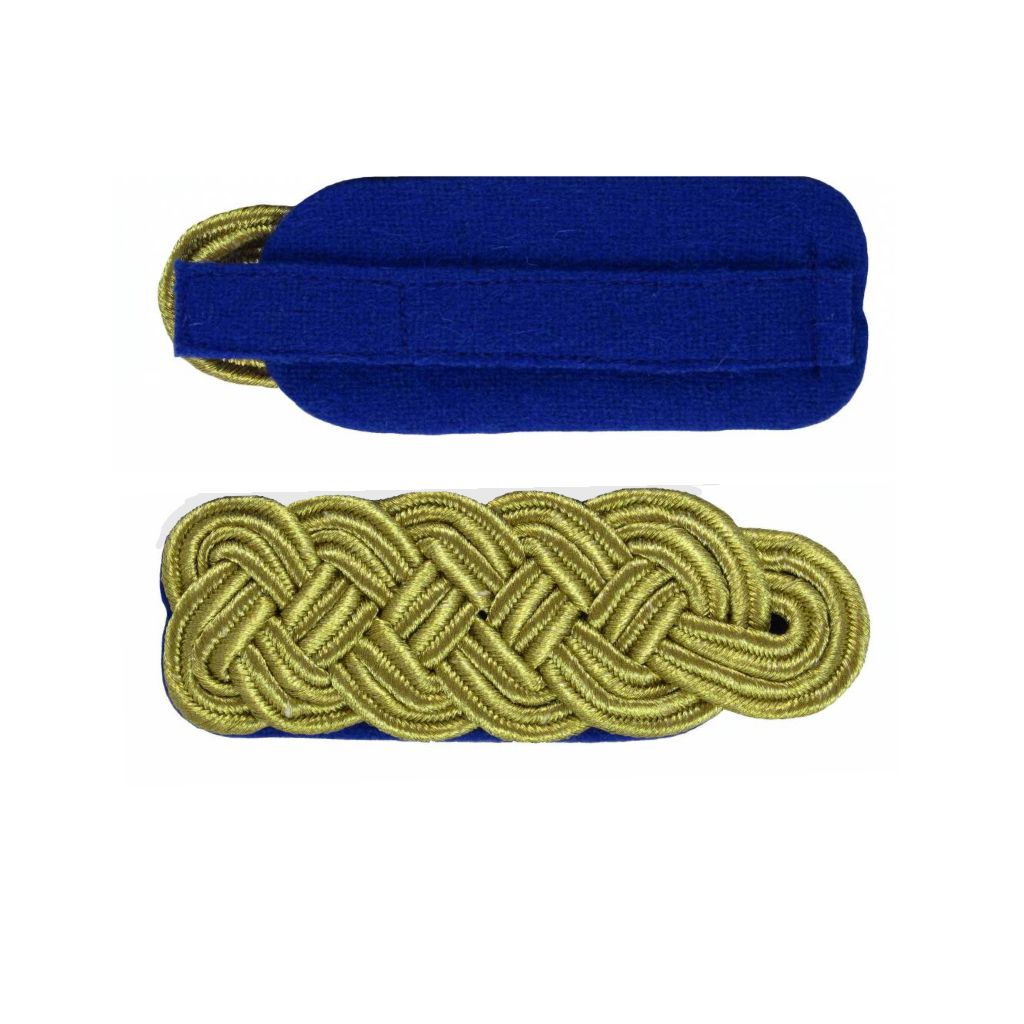 Gefertigt aus 6 mm breitem goldfarbenem Soutache, überzeugt dieses Majorsgeflecht durch seine gleichmäßige Struktur, hochwertige Verarbeitung und hohe Formstabilität. Die blaue Filzunterlage bildet einen ruhigen, eleganten Kontrast zum goldfarbenen Geflecht und verleiht der Uniform eine repräsentative, ausgewogene Optik.