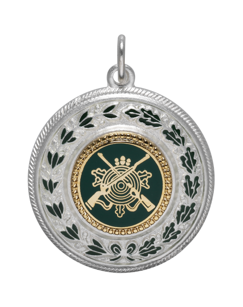 Dieser stilvolle, runde Anhänger (ca. 36 mm Durchmesser) besticht durch dunkelgrüne Eichenlaubblätter und eine elegante Schleife am Rand. Wähle zwischen verschiedenen Auflagen, wie der abgebildeten Zielscheibe mit Gewehren (A39.29), und veredle ihn durch eine individuelle Gravur.