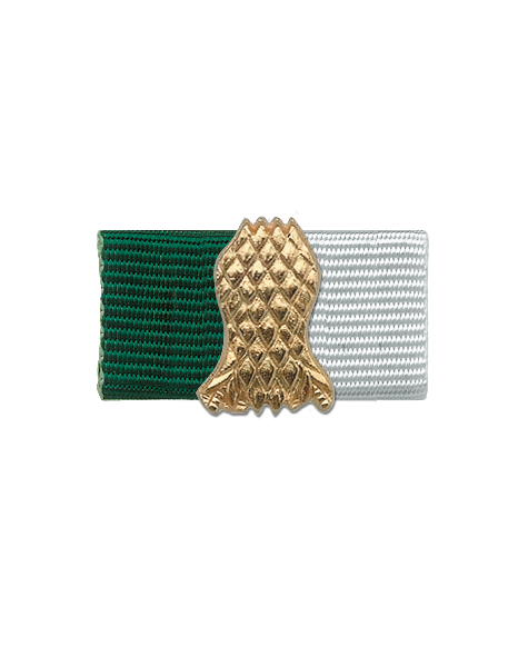 "Bandschnalle - Krone"Größe: 25 mm x 12 mmAusführung: grün-weiß, mit SicherheitsnadelAuflage: vergoldet, Motiv "Krone"