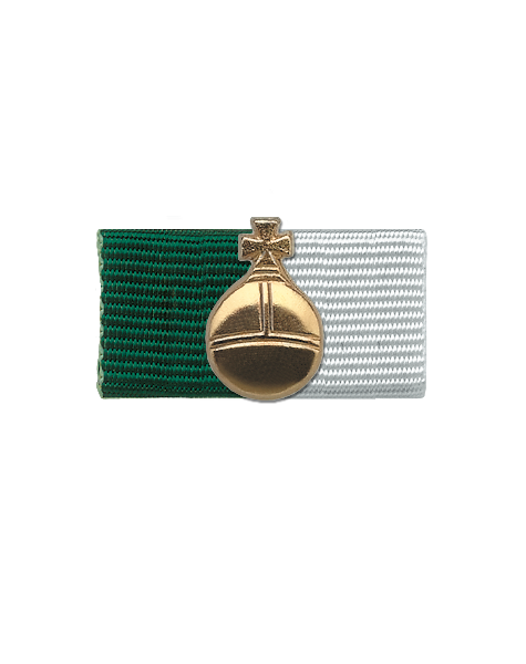 "Bandschnalle - Krone"Größe: 25 mm x 12 mmAusführung: grün-weiß, mit SicherheitsnadelAuflage: vergoldet, Motiv "Krone"