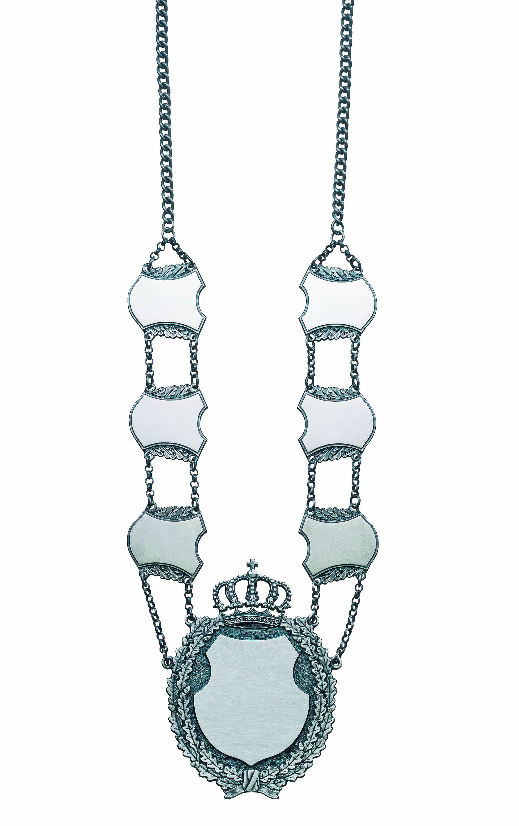 Eine versilberte Königskette die, trotz schlichter Eleganz, eine hohe Aussagekraft für den Würdenträger besitzt. Ihre 10 Kettenglieder je 22 x 27 mm und das Schild mit Verzierung und Krone, sorgen für einen unvergesslichen Auftritt.