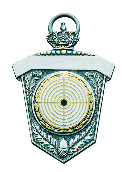 Dieser kleine, spitz zulaufende Königsorden ist ein wahres Meisterwerk der Auszeichnungskunst. Mit Eichenlaub, einer aufwendig verzierten Krone und der Auflage mit Zielscheibe ist er der ideale Orden für Schützenkönige und -königinnen.