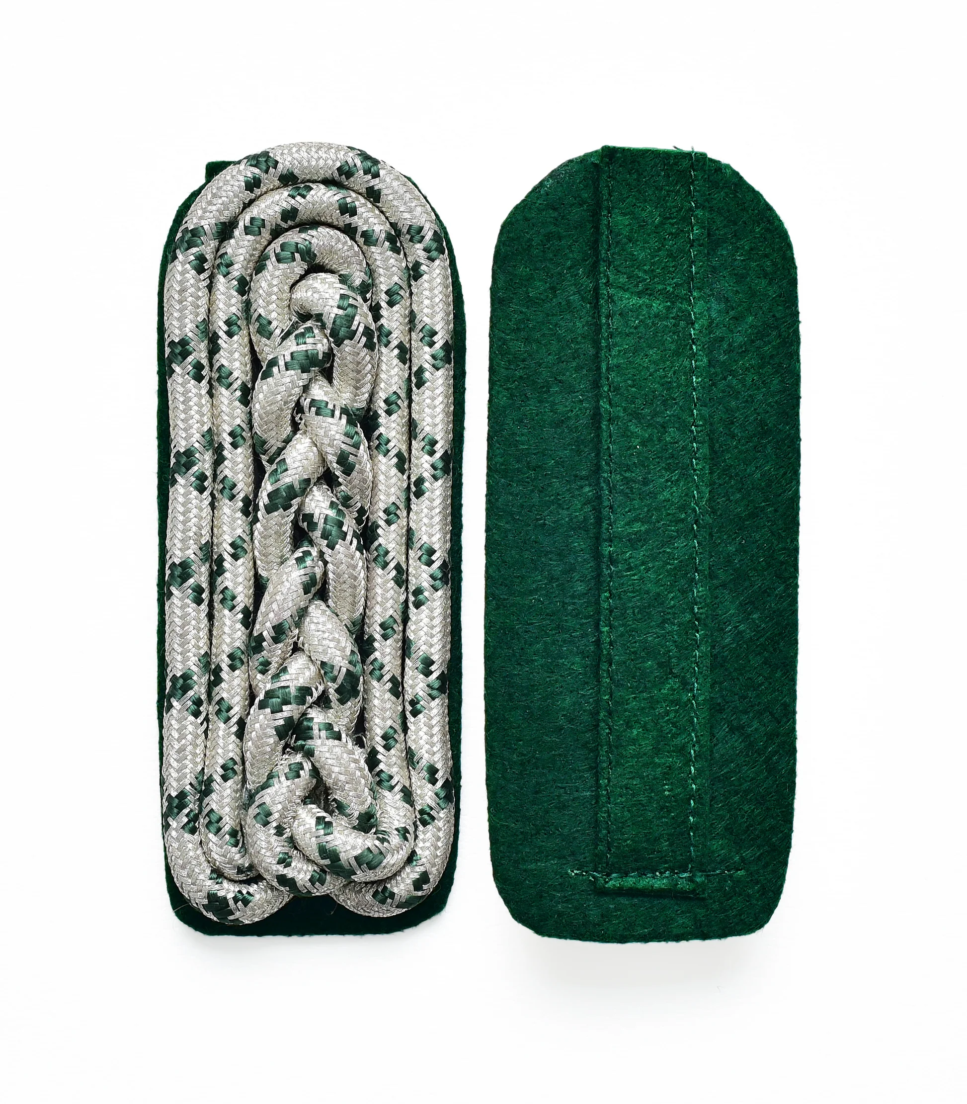 Schultergeflechte stehen in Schützenvereinen ausschließlich für die Darstellung von Rang und Funktion. Die Kombination aus Silber und Grün ist zeitlos, gut sichtbar und besonders beliebt bei klassischen Uniformkonzepten.