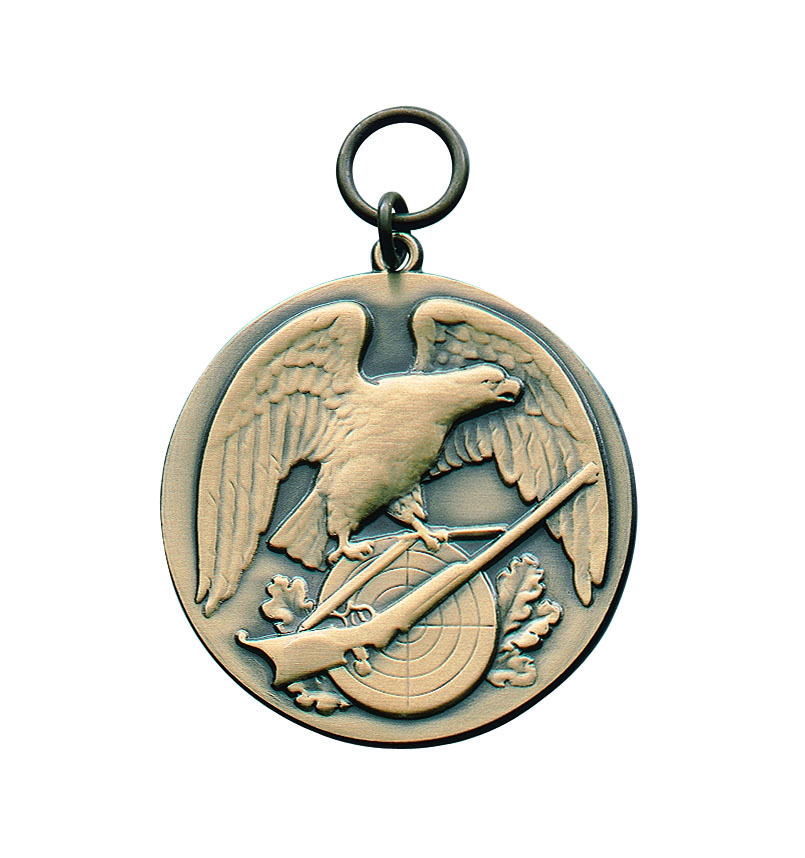 Medaille für Schützen und Schützinnen mit SchützenadlerRunde Medaille mit Adler auf einem Ast, kleiner Zielscheibe und GewehrDurchmesser ca. 33 mm oder 40 mm (Bitte auswählen!)Mit Öse und Ring zur sicheren BefestigungErhältlich in vergoldet, versilbert, Altsilber, Bronze und Echt SilberDiese Medaille kann durch eine individuelle Gravur auf der Rückseite veredelt werden.Sie ist in verschiedenen Größen und Farben erhältlich. Bitte wählen Sie Ihre gewünschte Ausführung.