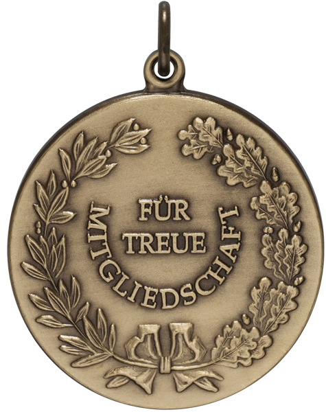 Die Medaille „Für treue Mitgliedschaft“ ist eine bedeutungsvolle Auszeichnung für langjährige Mitglieder eines Vereins. Mit Eichenlaub, einer dekorativen Schleife und der Aufschrift „Für treue Mitgliedschaft“ wird diese Medaille zu einer besonderen Ehrung. Der Durchmesser von ca. 40 mm bietet genügend Platz für die detaillierte Gestaltung. Erhältlich in vergoldet, versilbert, Altsilber und Bronze, lässt sie sich perfekt an die Vereinsfarben und die Bedeutung der Ehrung anpassen.