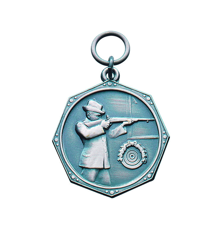 Diese achteckige Medaille ist das perfekte Stück für Schützen. Mit einem Schützen beim Schießen und einer kleinen Zielscheibe samt Eichenlaub ist sie eine edle Auszeichnung für sportliche Leistungen.
