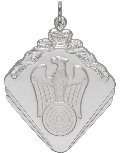 Diese edle Medaille in Rautenform ist eine perfekte Auszeichnung für Schützkönige und -königinnen. Der Adler auf einer kleinen Zielscheibe, umrahmt von Krone und Eichenlaub, symbolisiert Stärke und Tradition im Schützenwesen.