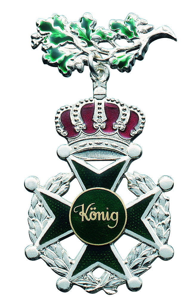 Königsorden mit Eichenlaub und goldenen AuflagenAltsilber Orden in ovaler Form mit Eichenlaubkranz, goldener Krone SchiessemblemGröße ca. 42 mm x 54 mmOberfläche mit galvanischer Veredelung (Schutzschicht) für besonders hohe WiderstandsfähigkeitVersehen mit einem feinen Speziallack, der das Metall, auch Silber, vor Feuchtigkeit und Schmutz schütztMit Öse und Ring oder Scharniernadel zur sicheren BefestigungErhältlich in Altsilber mit vergoldeten AuflagenDieser Orden kann durch eine individuelle Gravur auf der Rückseite veredelt werden.