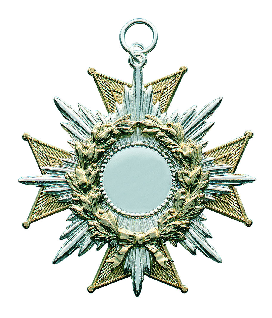 Dieser Orden kombiniert ein Kreuz und Stern mit einem goldenen Kranz und einer Gravurfläche für individuelle Beschriftungen. Die Größe beträgt ca. 70 mm x 70 mm, und er wird mit einer Öse und Ring zur sicheren Befestigung geliefert.