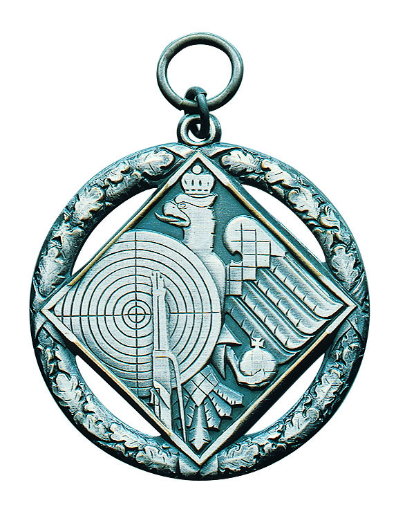 Medaille für Schützen und Schützinnen mit KönigsadlerRunde Medaille mit Eichenlaub und königlichem Adler hinter großer ZielscheibeDurchmesser ca. 33 mm oder 39 mm (Bitte auswählen!)Oberfläche mit galvanischer Veredelung (Schutzschicht) für besonders hohe WiderstandsfähigkeitVersehen mit einem feinen Speziallack, der das Metall, auch Silber, vor Feuchtigkeit und Schmutz schütztMit Öse und Ring zur sicheren BefestigungErhältlich in vergoldet, versilbert, Altsilber, Bronze und Echt Silber, versilbertDiese Medaille kann durch eine individuelle Gravur auf der Rückseite veredelt werden.Sie ist in verschiedenen Größen und Farben erhältlich. Bitte wählen Sie Ihre gewünschte Ausführung.