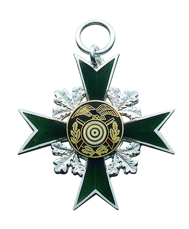 Dieser Orden in Kreuzform hat eine Breite und Höhe von ca. 45 mm und ist in den Varianten versilbert und echt silber erhältlich. Die Auflage zeigt eine Zielscheibe mit Adler und Gewehren.