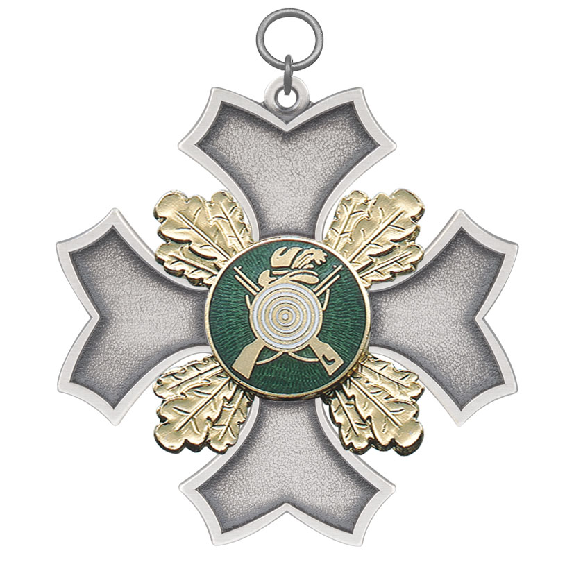 Dieser Orden in Form eines abgerundeten Kreuzes (ca. 52 x 52 mm) begeistert durch ein vergoldetes Eichenlaub und eine prächtige Zielscheibe mit Gewehren als Auflage. Ideal für Auszeichnungen bei Schützenfesten oder besonderen Anlässen.