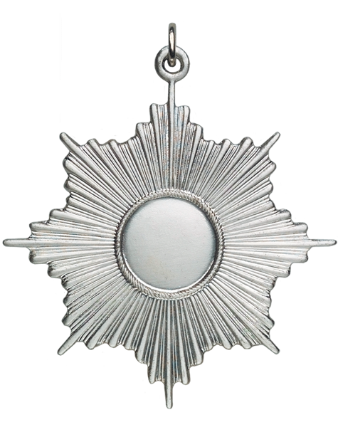 Dieser beeindruckende Stern-Orden (66 mm x 66 mm) ist in versilbert oder Echt Silber erhältlich und bietet eine elegante runde Gravurfläche, die sich ideal für eine individuelle Gravur eignet. Mit der Öse und dem Ring zur sicheren Befestigung ist der Orden sowohl funktional als auch stilvoll.