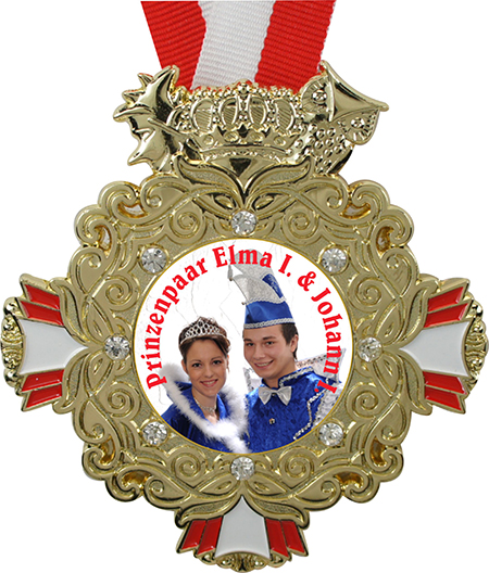 Produktinformationen "Prinzenpaar-Orden Rot/Weiß mit 3D Prägung & Glitzersteinen"