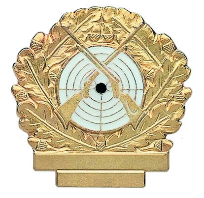 Dieses Abzeichen ist mit einer weißen Zielscheibe, gekreuzten Gewehren, Eichenlaub und einem kleinen Gravurfeld verziert. Perfekt für Schützen, die ihre Auszeichnung individuell gestalten möchten.
