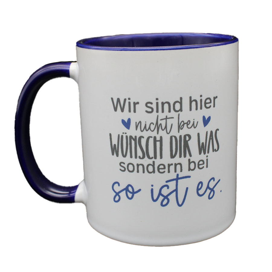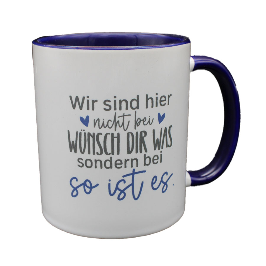 Bring einen Hauch von Humor in deinen Alltag mit unserer witzigen Tasse! Diese weiße Tasse besticht durch ihre dunkelblaue Innenseite und dunkelblauen Henkel, die ihr einen modernen Look verleihen. Auf der Vorderseite prangt der markante Spruch: "Wir sind hier nicht bei wünsch dir was, sondern bei so ist es."